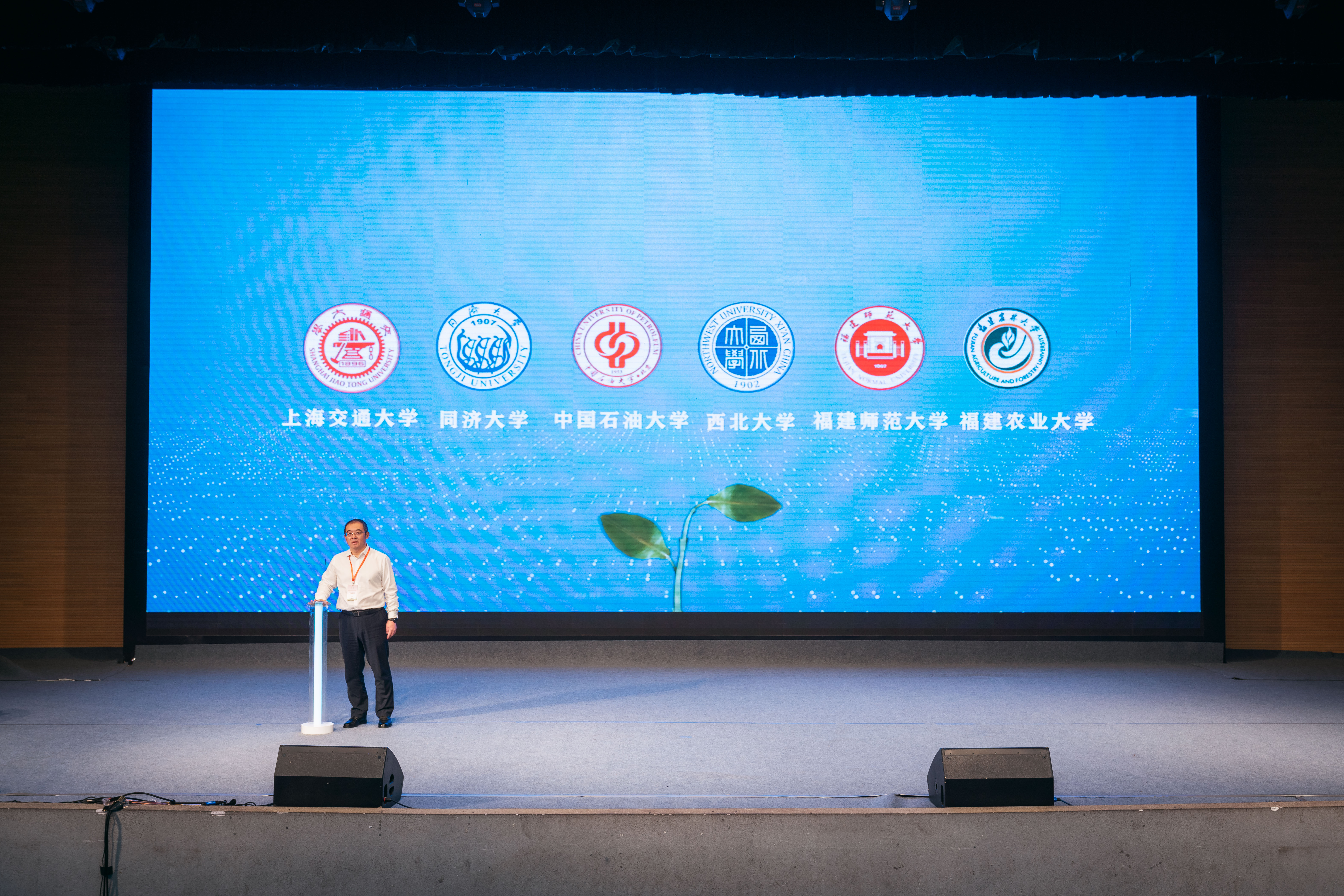 全国高校碳中和人才培养联盟启动仪式上,常江、张广清、福建师范大学副校长陈庆华、福建农林大学副校长唐振鹏、上海交通大学中英国际低碳学院院长赵长颖、同济大学本科生院副院长张宇钟共同按下了启动键。