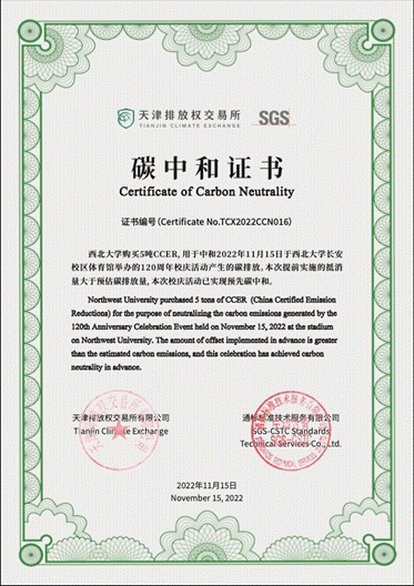 为落实国家“大型活动碳中和”要求,最大程度减低碳排放,创建环境友好型的校庆活动,碳中和学院与SGS(通标标准技术服务有限公司)合作为西北大学建校120周年大会提供碳中和服务,本次大会所产生的碳排放已通过注销国家核证自愿减排量(CCER)的形式进行中和,西北大学也因此成为国内首个实现校庆活动碳中和的高校。