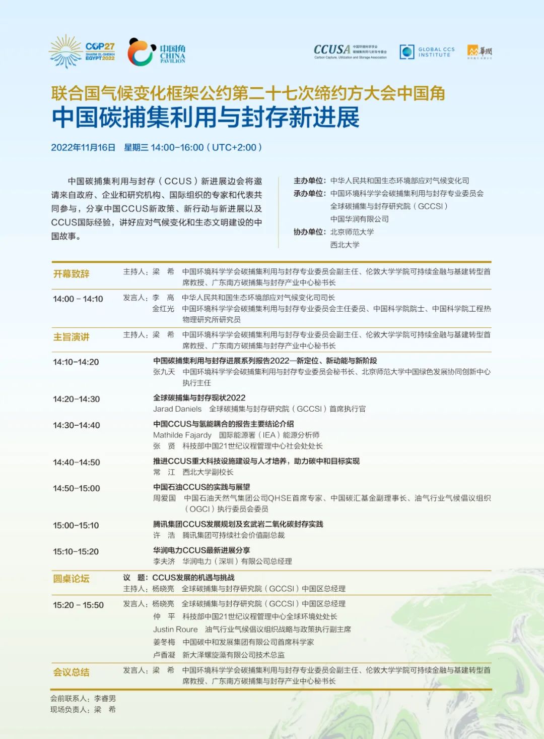 北京时间11月16日,作为《联合国气候变化框架公约》第27次缔约方大会的重要组成部分,中国角“中国碳捕集利用与封存(CCUS)新进展”主题边会在埃及沙姆沙伊赫举行。此次主题边会由生态环境部应对气候变化司主办,西北大学等单位协办,这是西北大学第4次协办联合国气候变化大会中国角边会。