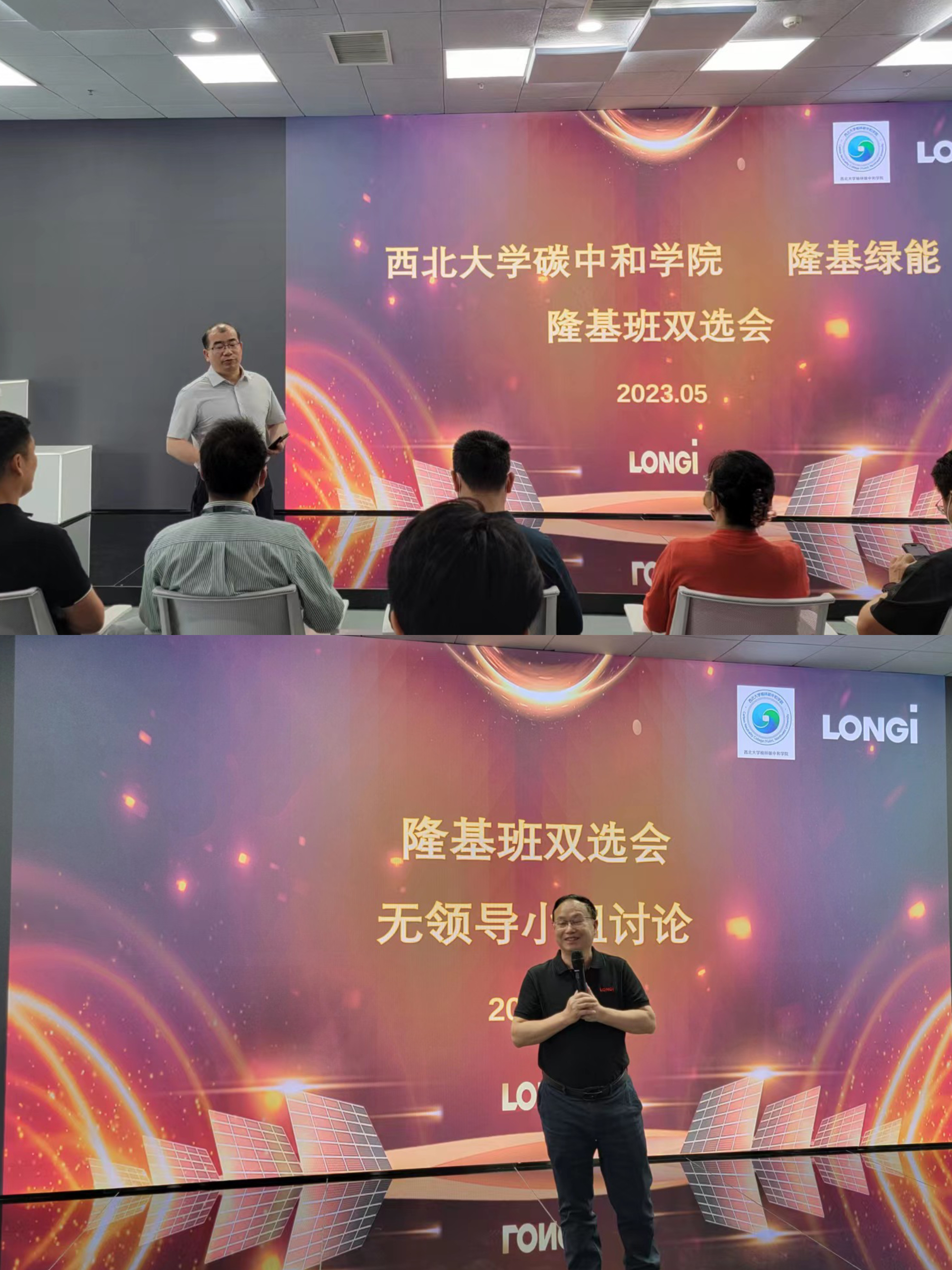 5月17日,碳中和学院23级专业硕士研究生与我校化学与材料科学学院、化工学院、城市与环境学院的14位导师赴隆基绿能科技股份有限公司(简称“隆基绿能”)进行隆基班双选会,选拔匹配隆基中央研究院发展需求的学生定向培养。隆基绿能中央研究院人力资源部负责人何云峰、研发高级主任工程师彭博士、研发高级主任工程师薛博士、隆基绿能品牌管理部雇主品牌经理周浩、碳中和学院负责人出席会议,隆基绿能中央研究院人力资源部校招经理鲍世杰主持会议。