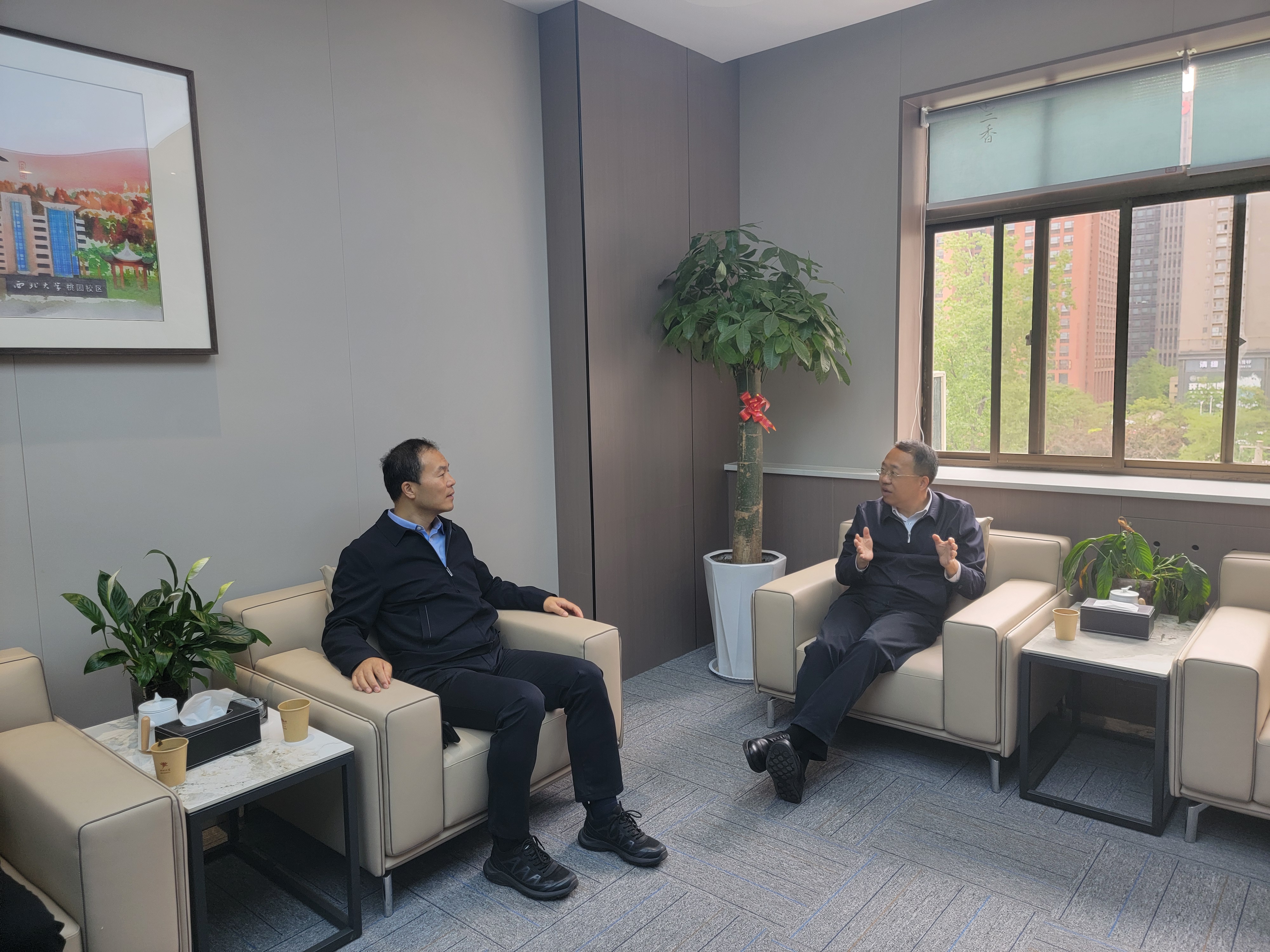 会后,吕建荣与赵勇就深化校地合作、加快我校科技成果在榆落地转化和碳中和学院建设进行了座谈。吕建荣代表西北大学对榆林市委市政府长期以来对学校各项事业的支持表示感谢,同时表示学校将不断改革创新,充分发挥综合型大学学科优势,强化服务榆林经济社会发展能力,持续推进科技成果转化“三项改革”工作在榆落地生效,有力赋能榆林培育新质生产力、助力榆林高质量发展。