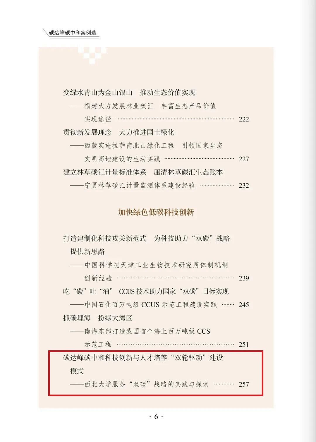 日前,国家发展和改革委员会资源节约和环境保护司、全国干部培训教材编审指导委员会办公室组织编写的《碳达峰碳中和案例选》出版,我校“碳达峰碳中和科技创新与人才培养‘双轮驱动’模式——西北大学服务‘双碳’战略的实践与探索”入选,为陕西省唯一入选案例。