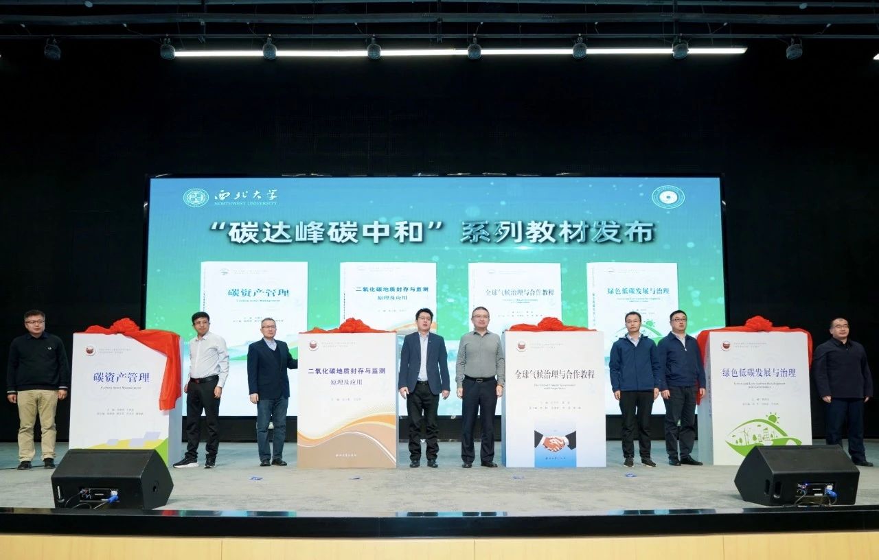 学院联合隆基绿能、西安中碳等企业编写了碳达峰碳中和系列教材。活动上,校企主编共同为《二氧化碳地质封存与监测》《绿色低碳发展与治理》《全球气候治理与合作教程》《碳资产管理》等首批教材揭幕。