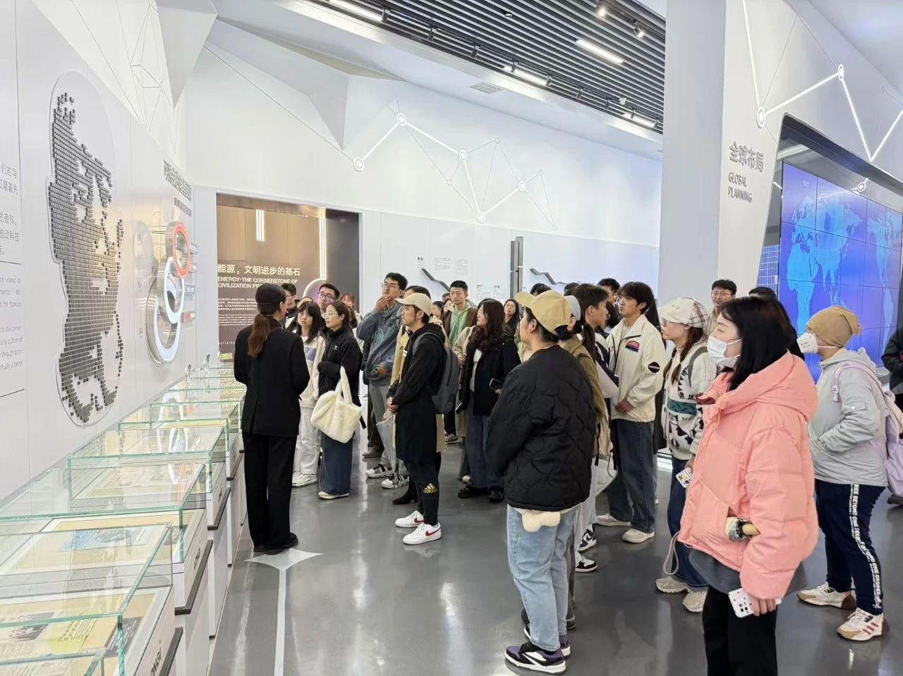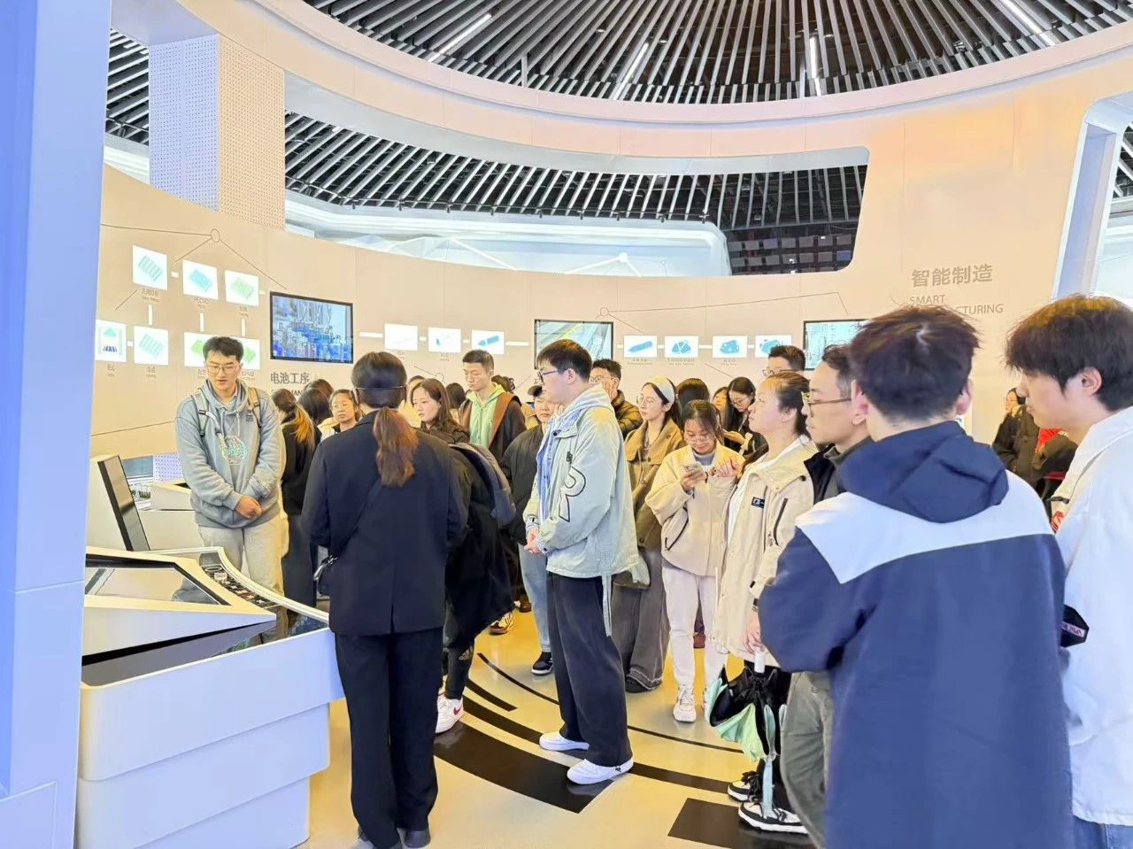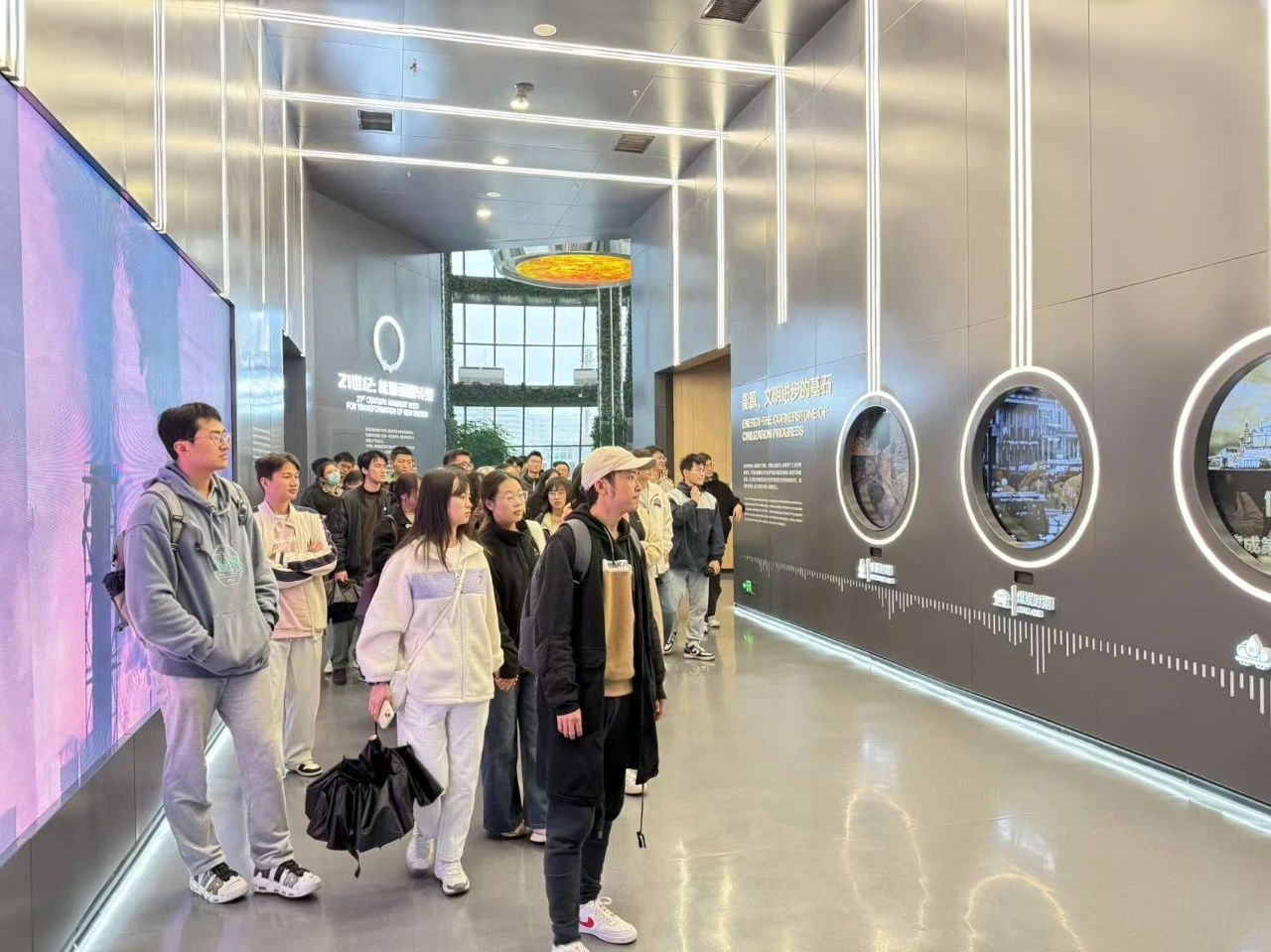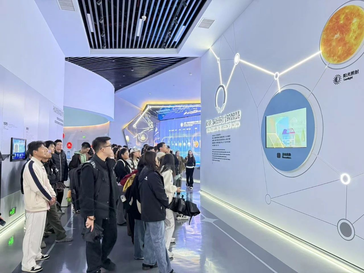 学生们首先参观了隆基绿能智慧能源展览馆。通过生动的多媒体互动以及实物模型演示,学生们近距离对光伏产业的前沿技术、生产应用等方面有了更加深入的了解。