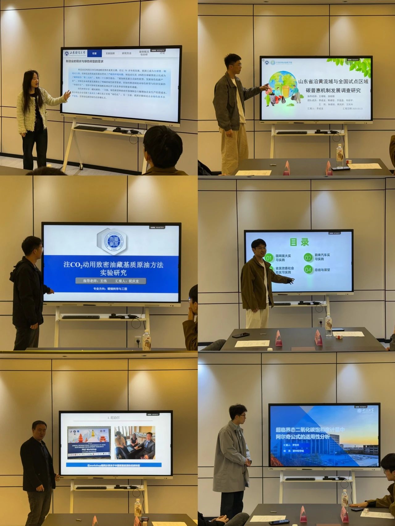 当天下午,山东财经大学中国国际低碳学院与必赢贵宾会3003官网学生开展研究生学术沙龙活动。双方学生代表分别就“制造企业实现绿色转型研究热点与展望”“基于山东省沿黄流域与全国试点区域碳普惠机制发展调查研究”“注CO2动用致密油藏基质原油方法实验研究”“碳中和学习心得感悟——从专业实习实践角度谈”“2024中国碳中和事业的见闻与体会”“超临界态二氧化碳饱和度计量中阿尔奇公式的适用性分析”等主题进行交流分享。