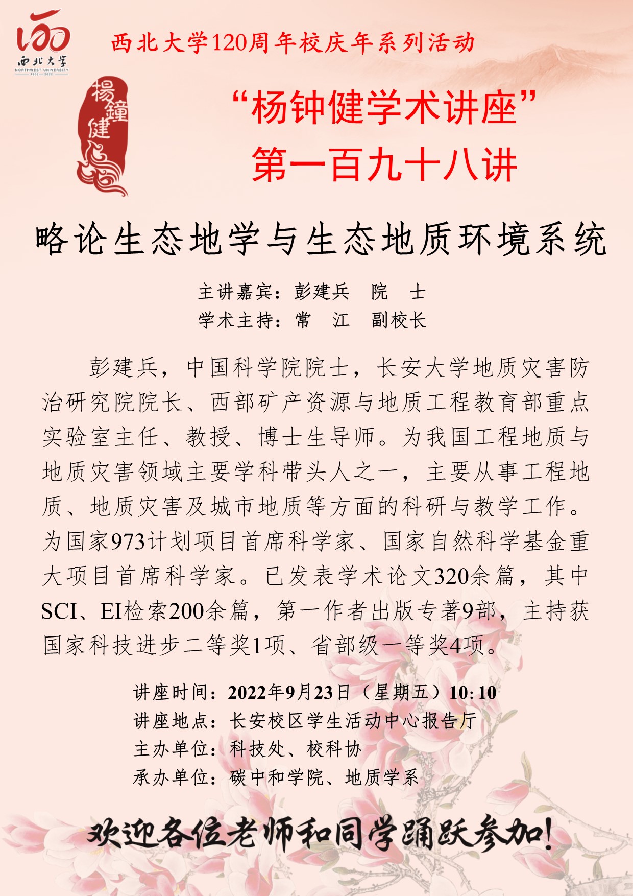 “杨钟健学术讲座”第一百九十八讲暨120周年校庆年系列活动:略论生态地学与生态地质环境系统 讲座时间