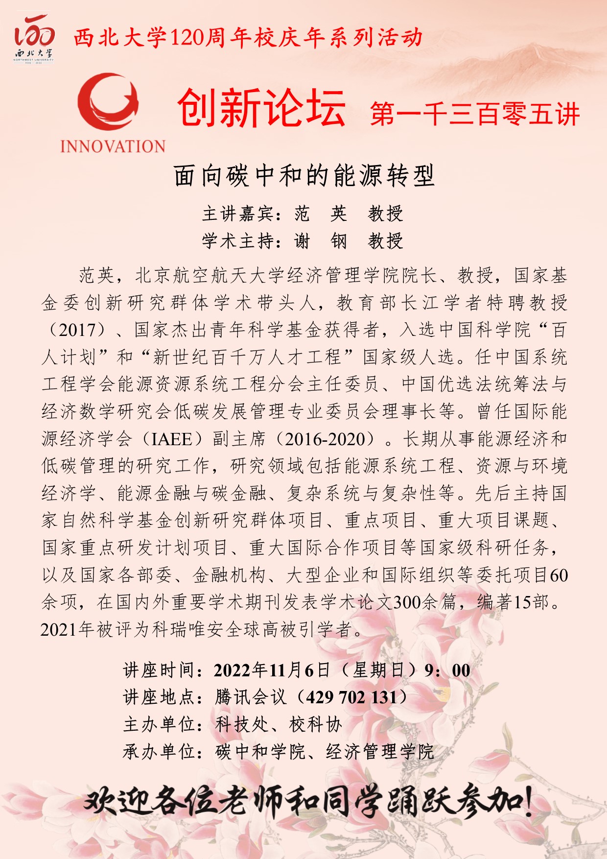 西北大学创新论坛第一千三百零五讲暨120周年校庆年系列活动: 面向碳中和的能源转型